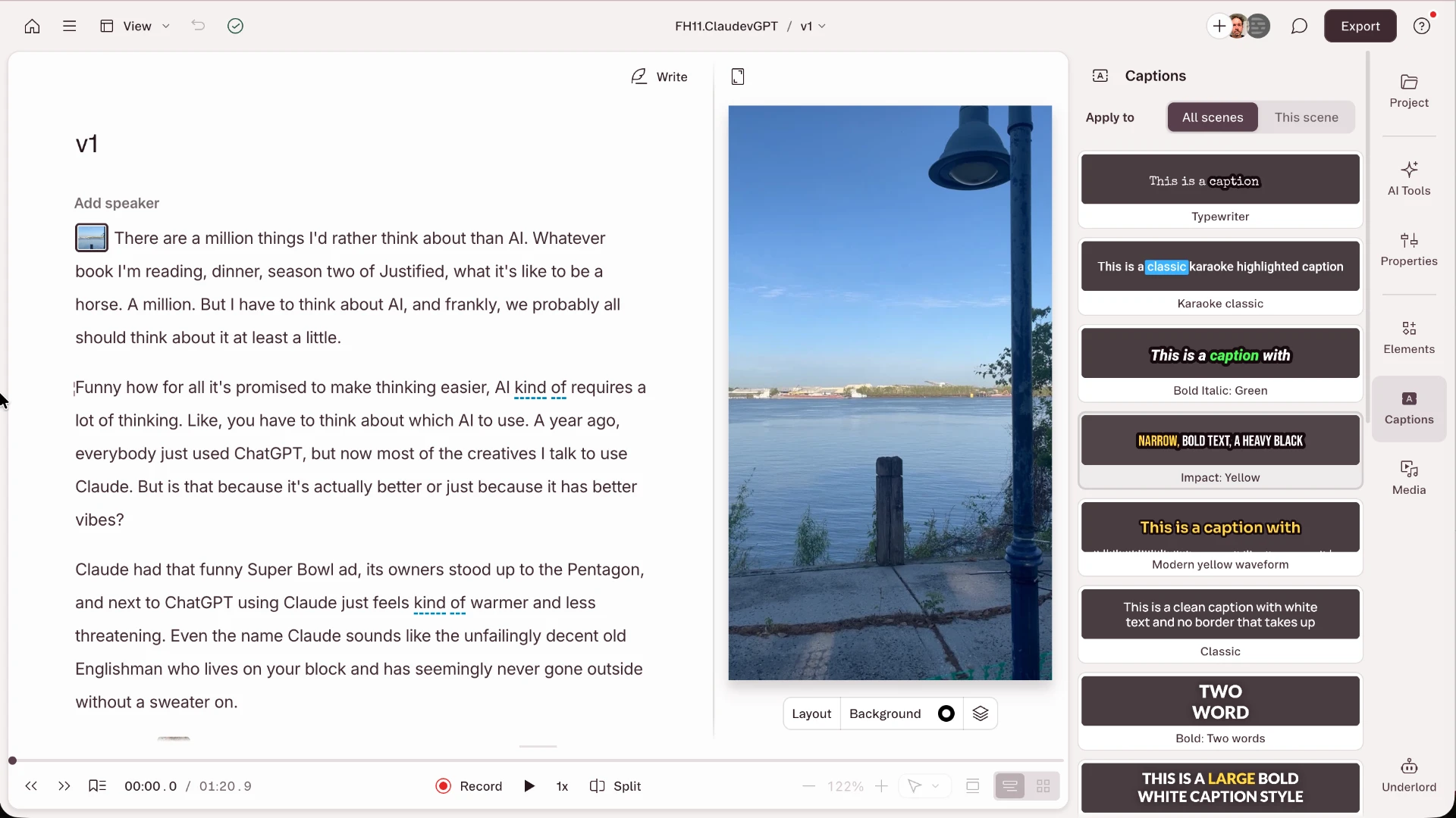 Descript's free plan includes caption generation, styling, and export. You get one hour of uploaded media a month, with unlimited captions and styling. For short social videos — the exact use case where CapCut's free captions used to live — that should be enough. (You also get 100 AI credits lifetime; enough for a taste of all the AI editing, generation, and creative support tools Descript serves up.)