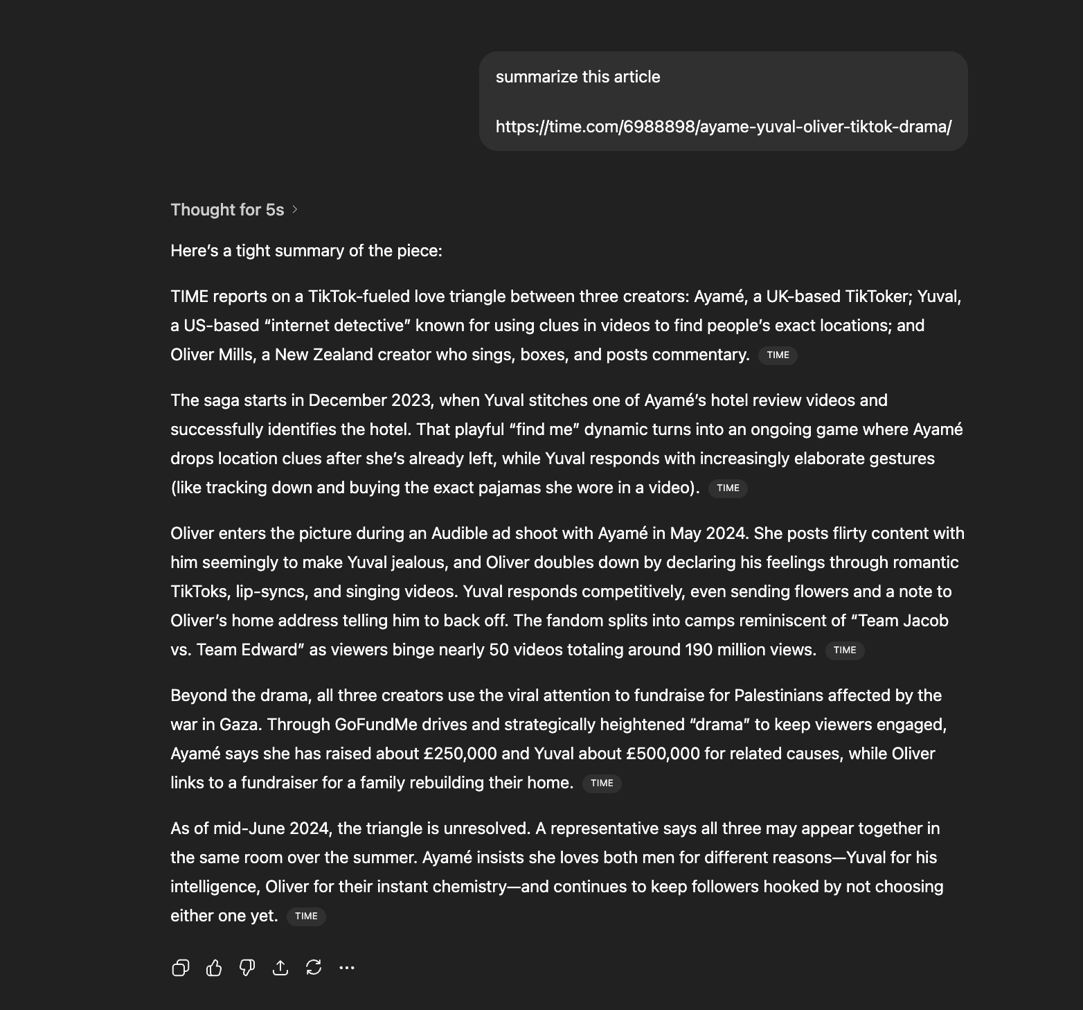 When I asked both Sonnet and ChatGPT to summarize an article about the Ayamé-Yuval-Oliver TikTok drama, their summaries were both pretty good.