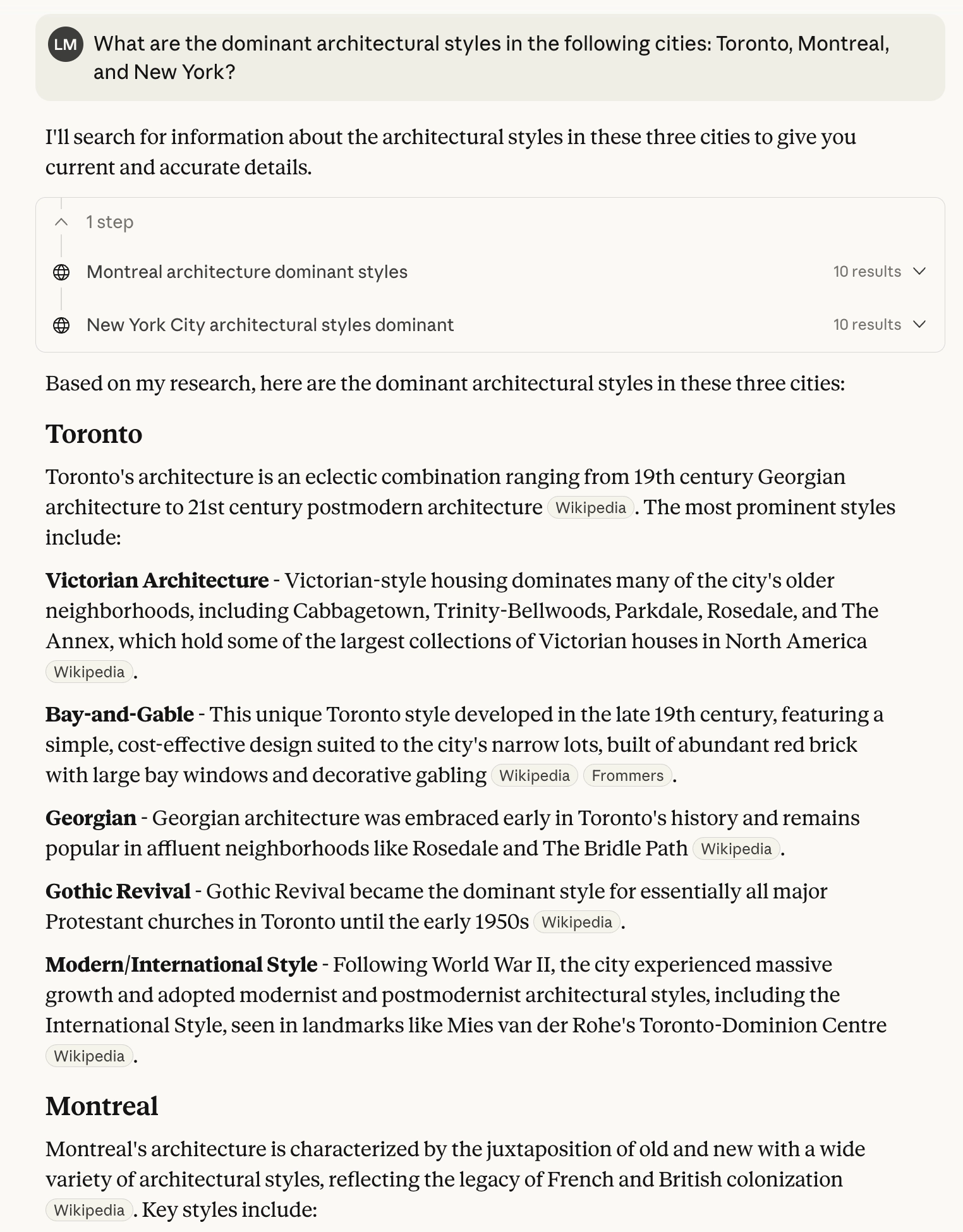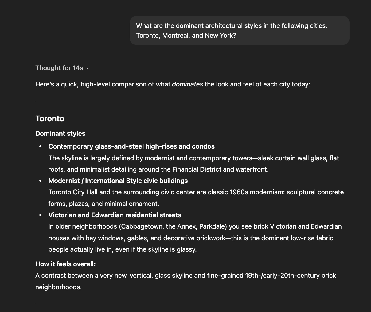 For example, when I asked about architectural styles in three different cities, ChatGPT leaned into its web search capabilities to provide a detailed, fact-heavy response. Sonnet used its reasoning steps to synthesize a more cohesive narrative.