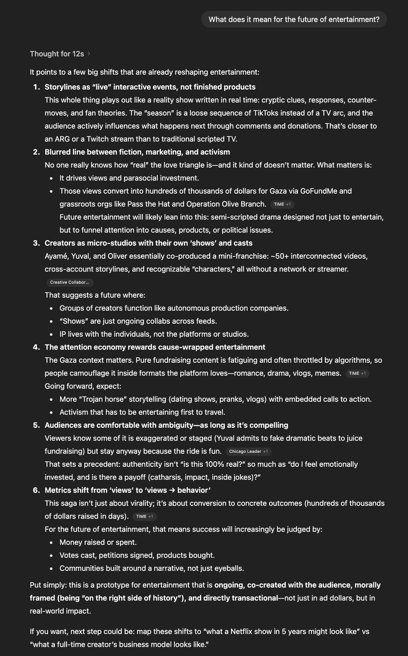 When it came to discussing the implications for the future of entertainment, I was pleasantly surprised by the quality of ideas Sonnet generated. Head-to-head with GPT-5.1, I could cherry-pick the best ideas from both.