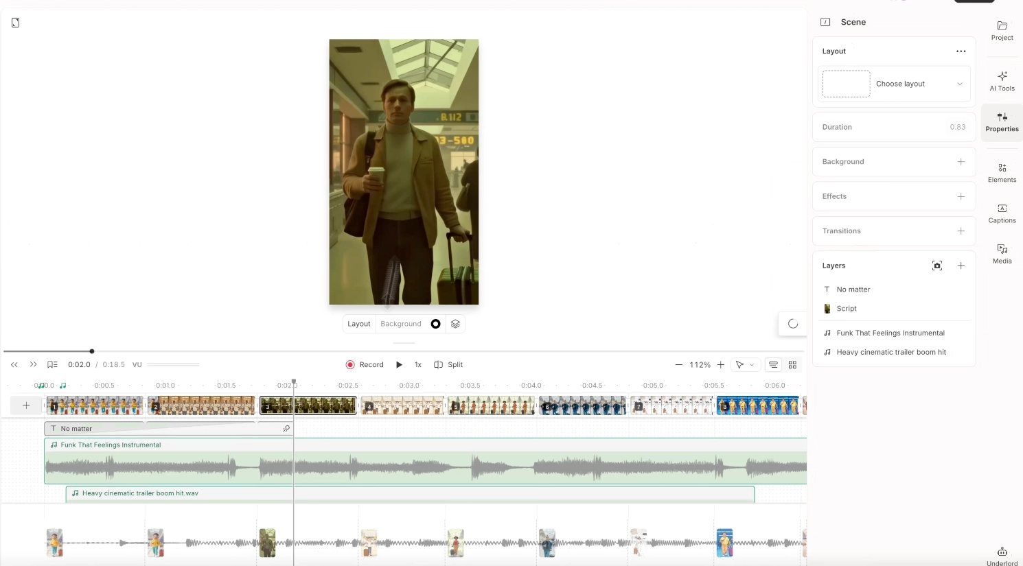 Let's walk through making a stylized montage—something like a guy walking through an airport in different art styles. Normally this would be impossible for most of us. In Descript it's... un-impossible.