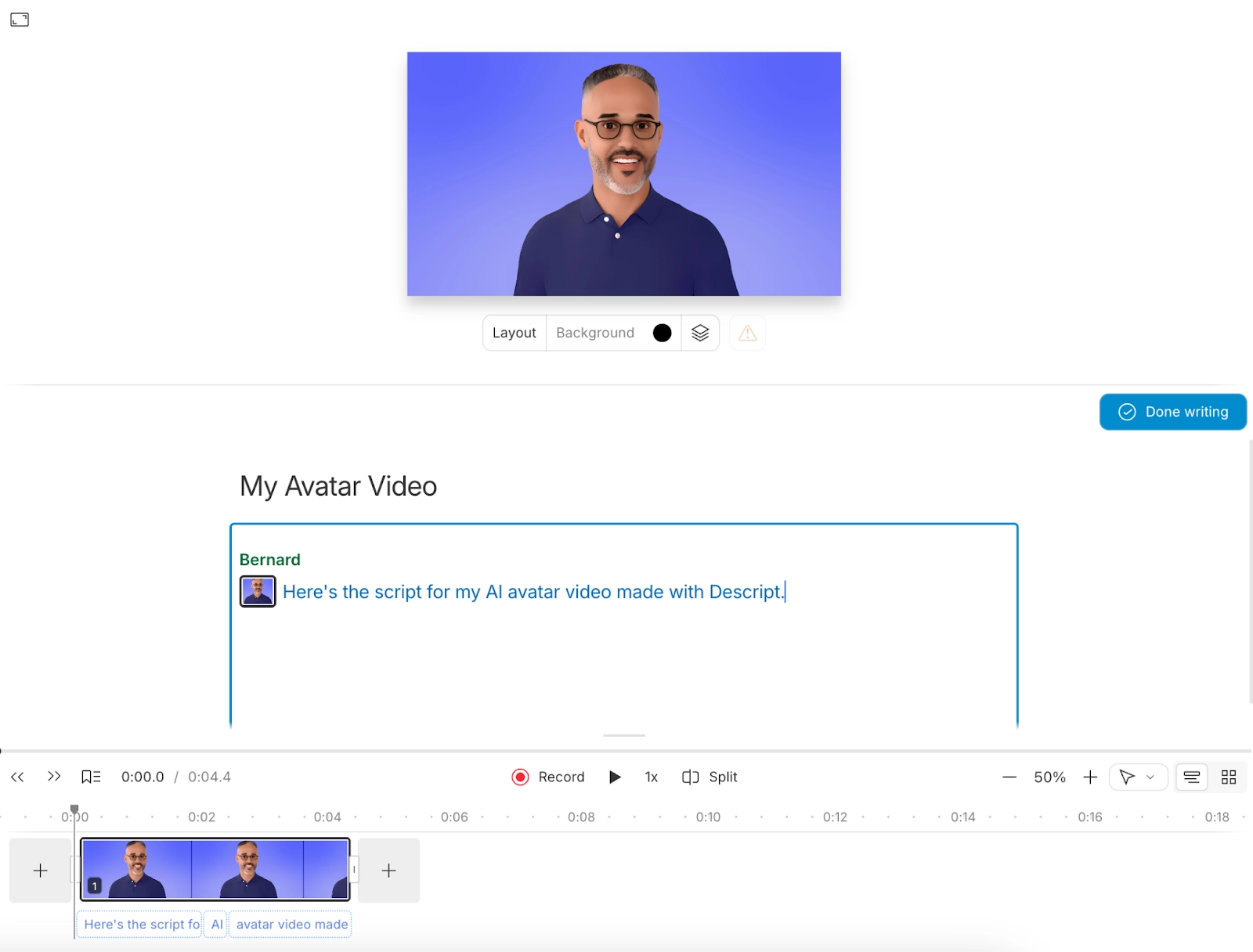 - Exit Write mode to generate AI speech. When your script is ready for a test run, click “Done writing.” Descript will generate AI speech for your chosen voice.