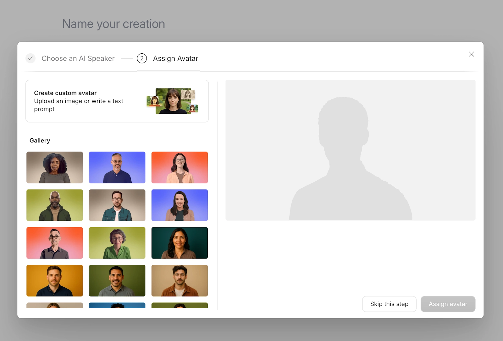 - Assign the avatar. Once you’ve found the right character or uploaded your photo, click “Assign avatar.” Descript now knows this voice + this face = your on-screen presenter. IMPORTANT: Don’t generate your video yet—you want to get everything else just the way you want it before you hit Generate.