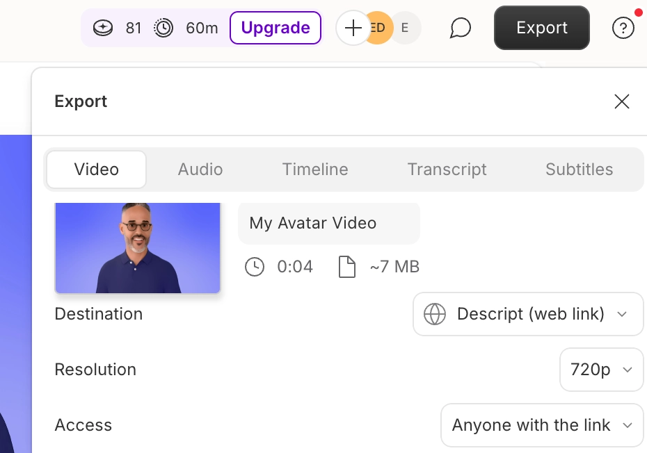 - Share via link. If you’d rather not download a huge file, you can share it straight from Descript with a shareable link.