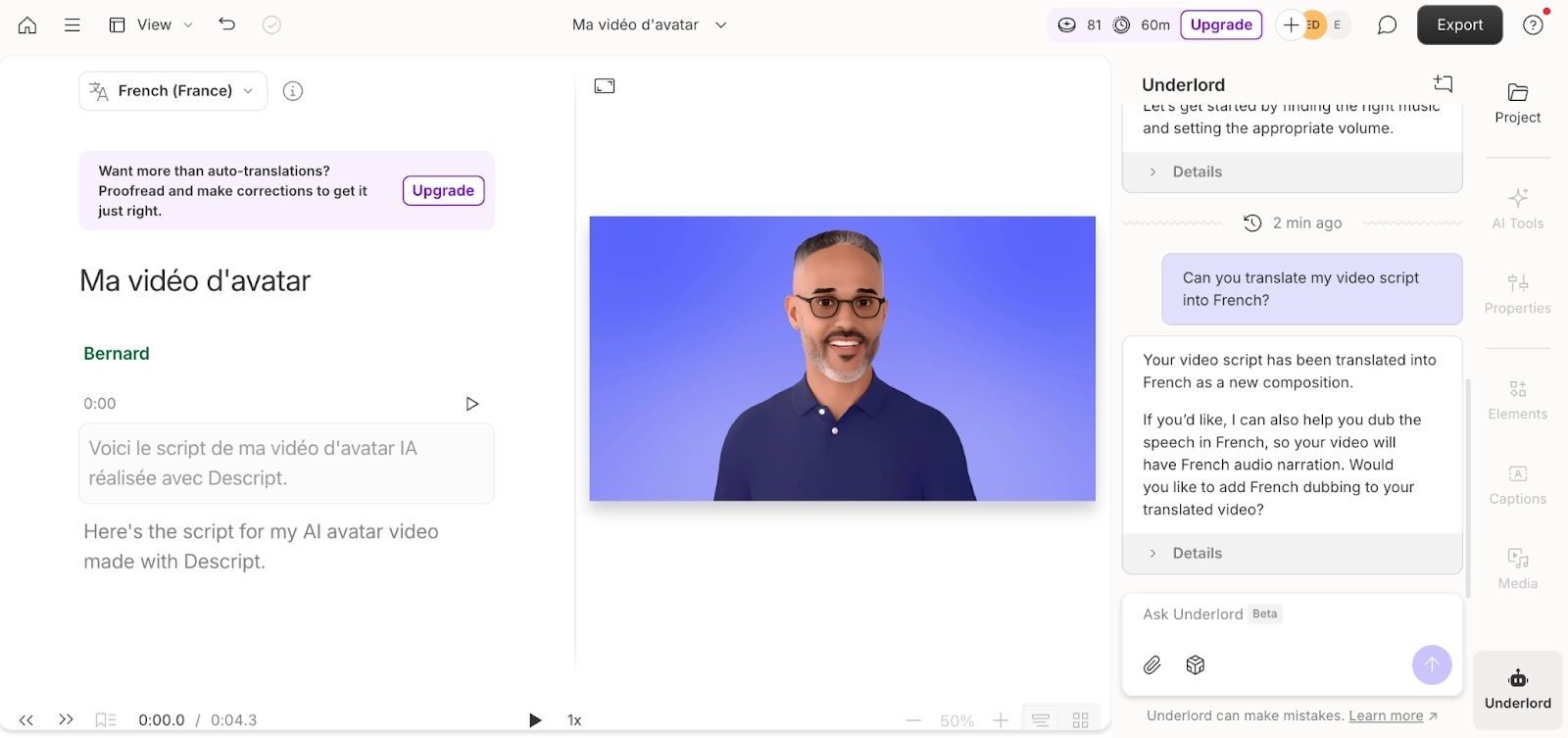 💡Tip: Lacking editing expertise? Lean on Underlord, Descript’s AI assistant; it can help edit your video. Ask it to shorten word gaps, draft accompanying social media posts, translate your video into more than 20 languages—or whatever you want to ask it.