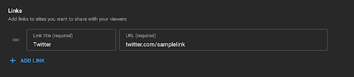 4. Scroll down to the “Links” section and click on “ADD LINK.” From there, enter the name of the social media platform you’re linking to under “Link title” and the URL of your profile in “URL.”