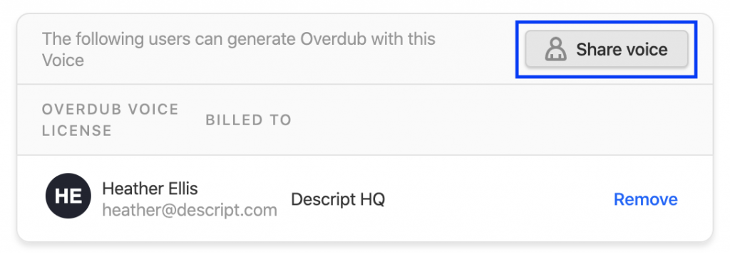 After creating your Overdub Voice, you’re now able to share your Voice with other team members on a shared drive so they can create Overdubs in your own Voice. A single Voice can be shared with an unlimited number of team members, but each team member can only access up to three Overdub Voices. If your team members require access to more than three Overdub Voices at once, please contact us about an Enterprise account.