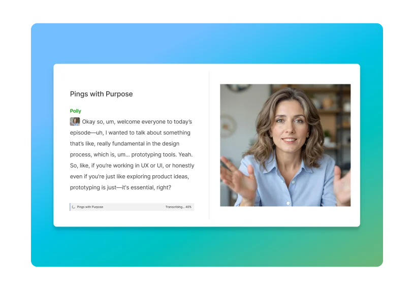 In Descript, you edit video by editing the transcript—or by telling Underlord, your AI co-editor, exactly what you want. And when a video needs updating, no need to reshoot: just replace the text, and let AI generate new audio.