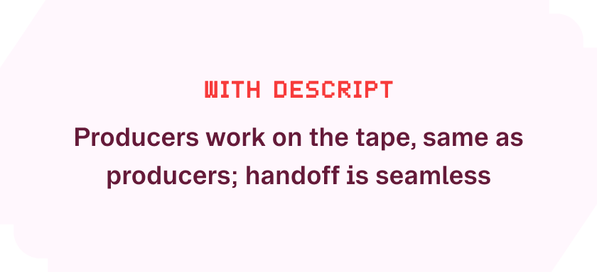 Now, producers work directly on the transcript in Descript, shaping the narrative with full audio context. They highlight sections and drop comments to flag jagged transitions or suggest fixes. Editors then quickly assemble rough cuts, also in Descript. Once those are locked, editors export to a DAW and work their magic on the final mix.