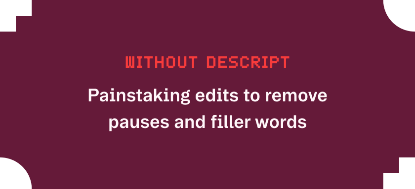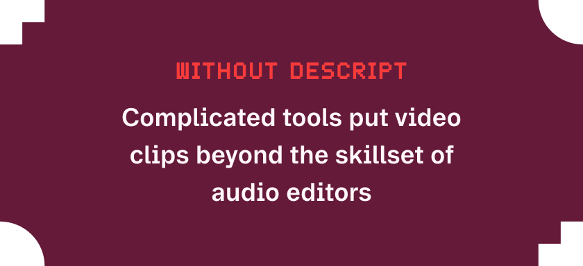 Before Descript, iHeart's podcast production was hindered by siloed workflows and tedious manual editing. Audio editor didn’t have the knowledge or skills to create video content for promotion. Repetitive, time-consuming editing across separate toolsets slogged down production and made it difficult to increase output without burning out teams.