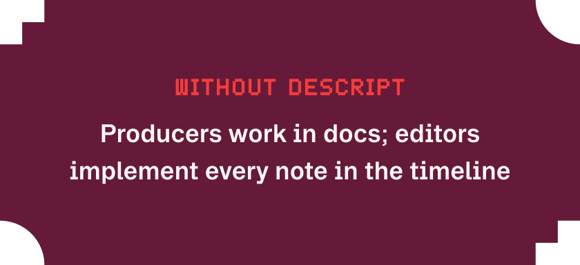 Before Descript, producers built narratives in timestamped Google Docs, then handed them to editors, who spent hours hunting down each clip in the timeline. Working on separate surfaces made collaboration clunky and created repetitive, tedious work.