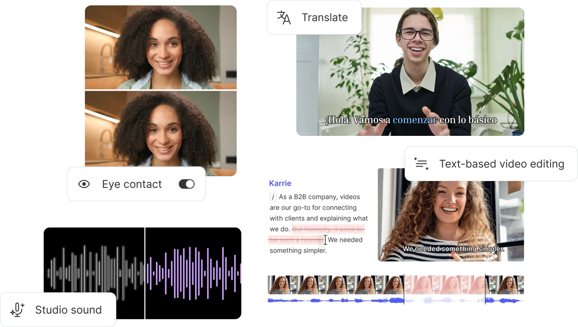 Clean up background noise, remove echo, and enhance speakers’ voices. No fancy mics, no soundproofing—just Descript’s AI.