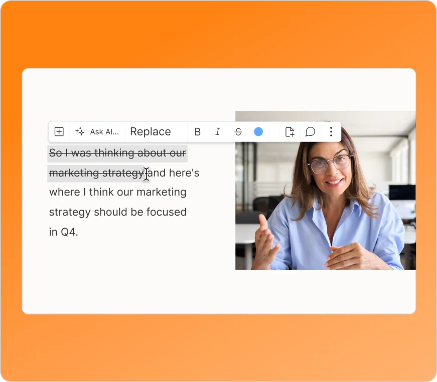 Record with your team or guests in 4K multitrack video, then start editing, just like you edit a doc. Use AI to make all the obvious edits, and templates for brand consistency.