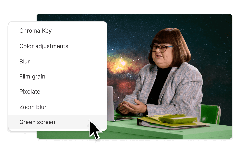Descript lets you make AI-powered edits in one click to create professional video even if you’ve recorded it on a laptop, in your bedroom, with your dog barking in the back—in one take. Studio Sound eliminates background noise and enhances voice audio, Green Screen lets you remove and replace your video background. Plus, the text-based video editor makes flagging and removing filler words a breeze.