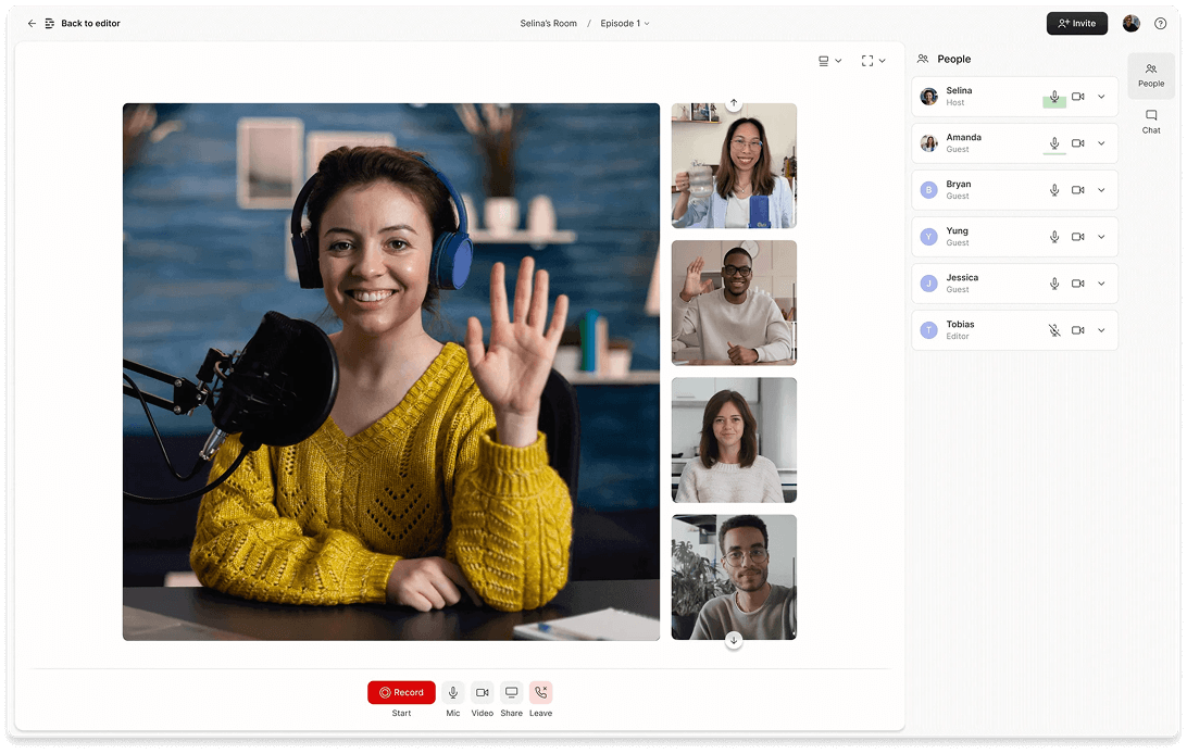 Transform your podcast into captivating video segments with AI. Record, edit, and publish—everything happens in one seamless workflow.