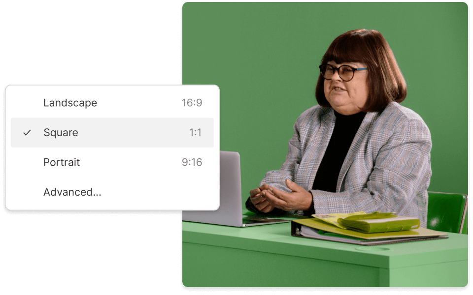 Descript lets you switch between horizontal, square, or vertical dimensions. You can fill empty areas with captions or other visuals to keep it looking sharp.