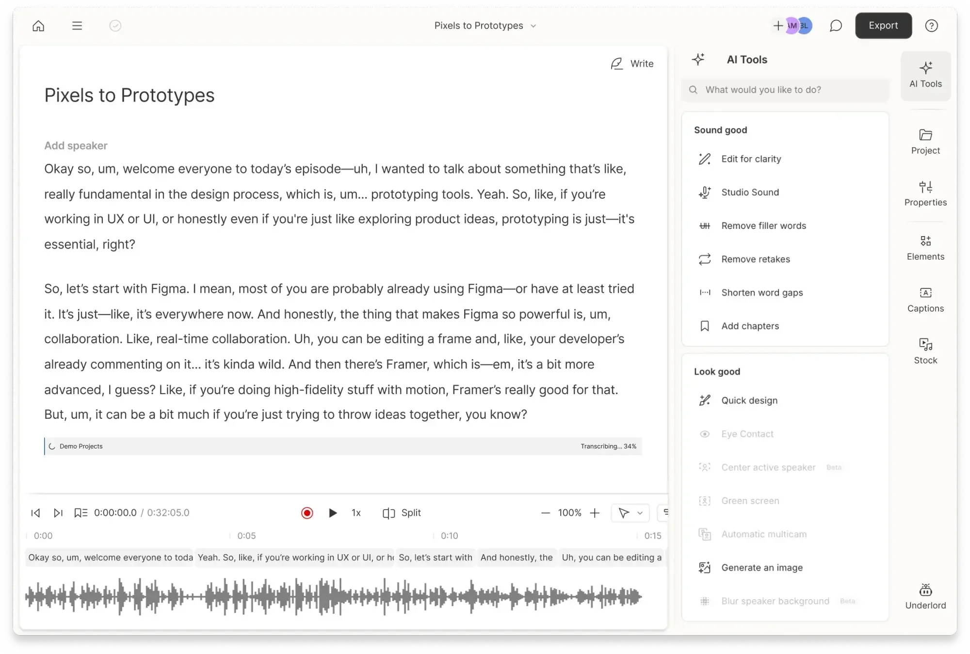 AI tools including Studio Sound, Remove Filler Words, Create Clips, and more